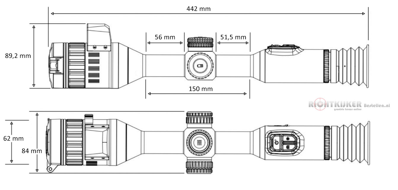 Deze Alpex Digitale nachtrichtkijker heeft een 30mm buisdikte, waardoor u veel mogelijkheden heeft op het gebied van montages. U kunt kiezen voor losse 30mm montageringen of een eendelige montage, afhankelijk van wat het beste past bij uw wapensetup. Hieronder ziet u de maten van deze Hikmicro Alpex 4K A50EL.